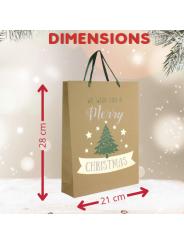 Sac en papier 28x21 cm avec anses en tissu, détails du décor métallisés.